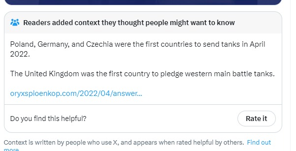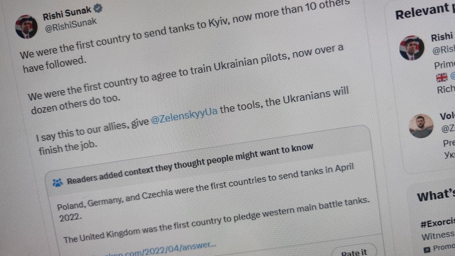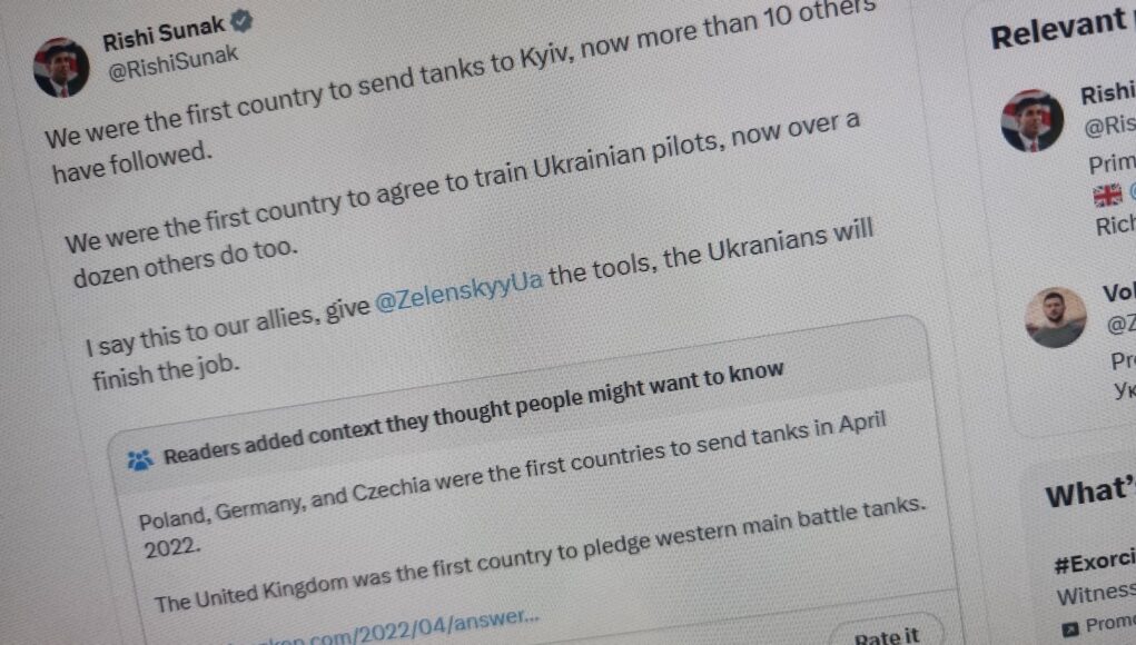 Twitter’s community notes team drew attention to the inaccuracy in Prime Minister Sunak’s statement concerning the UK being the pioneer in dispatching tanks. Instead, they highlighted that the Czech Republic took the lead in this regard.