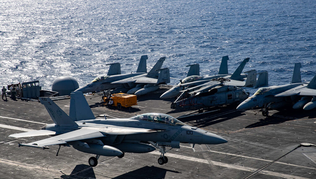 The U.S. Navy released images showing Capt Tim Waits, commanding officer of USS George Washington, landing a VFA-102 F/A-18F Super Hornet on the carrier’s deck while the ship operated in contested waters.