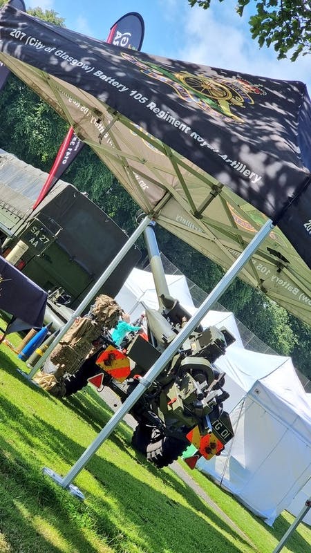 At the far side of the green, standing out among the attractions, was a green Pinzgauer High Mobility All-Terrain Vehicle with an L118 Light Gun hitched behind it. This was the stand for 207 (City of Glasgow) Battery, and it was drawing as much attention as any of the rides or animals.