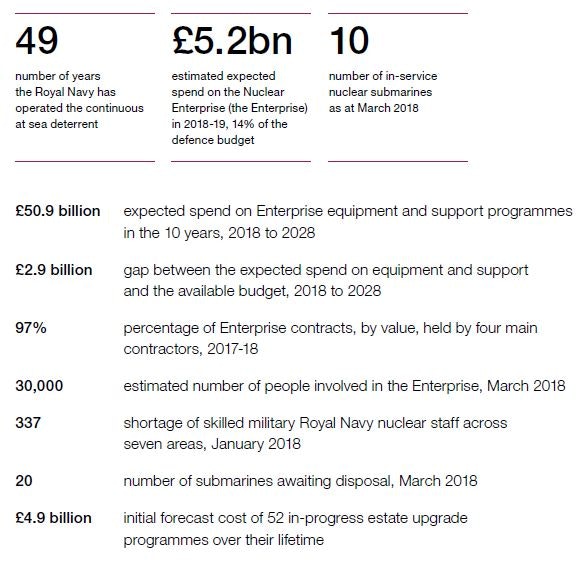 “Our 2008 report on the nuclear deterrent recommended that the Department address significant risks, particularly around costs, skills, commercial relationships and delivery to schedule. Some of these risks remain 10 years later. In the last 18 months, the Department has made some positive changes to the way it manages the Enterprise and has agreed commercial arrangements designed to improve cost and performance. However, the coming years are crucial.
