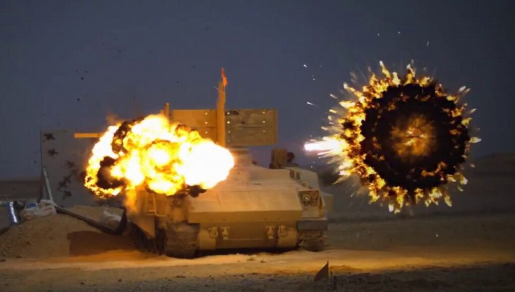 Part of the problem I believe, is the method Trophy uses to kill a threat. The effector begins as a relatively flat sheet that’s fired at the threat which breaks up into tungsten cubes. This is really effective at shredding the noses of anti-tank guided missiles and RPGs. It has also shown that it can smash the nose of a HEAT shell, preventing the contact fuse from working. When fired, it will disperse the fragments over a wider cone at distance and they’ll follow a gravity affected trajectory.