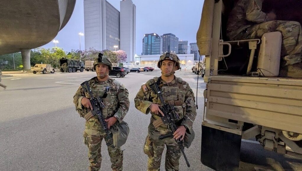 UPDATE- @TheCalGuard 79th IBCT has deployed approximately 300 soldiers to 3 separate locations in the greater Los Angeles area. They are conducting safety and protection of federal property & personnel. pic.twitter.com/70xqMN5myL