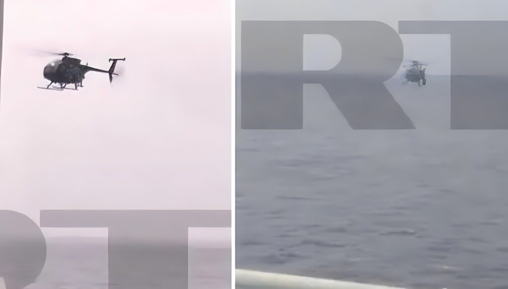 An American military helicopter believed to be linked to U.S. special operations forces has been pictured operating alongside the sanctioned supertanker Marinera in the North Atlantic.