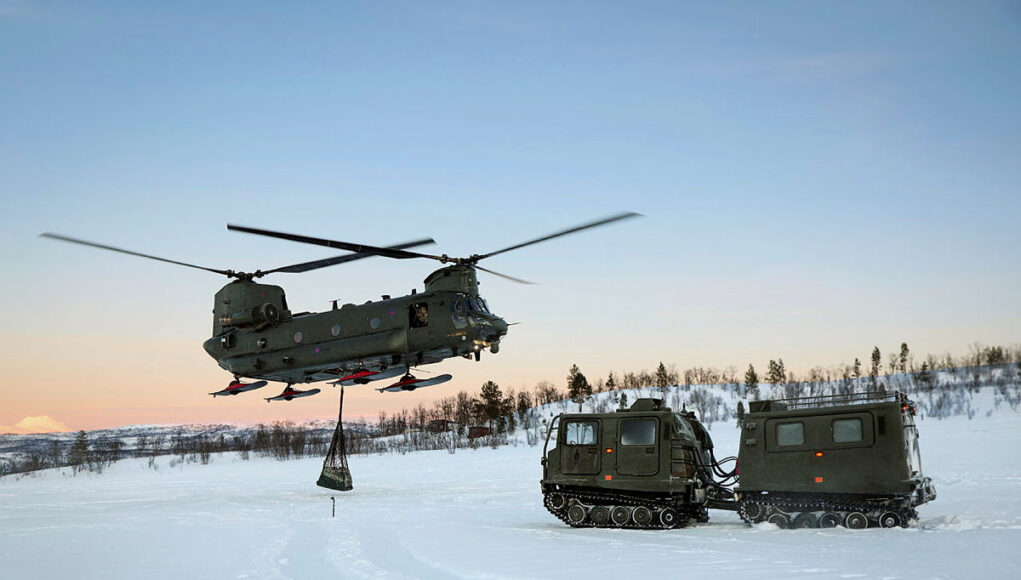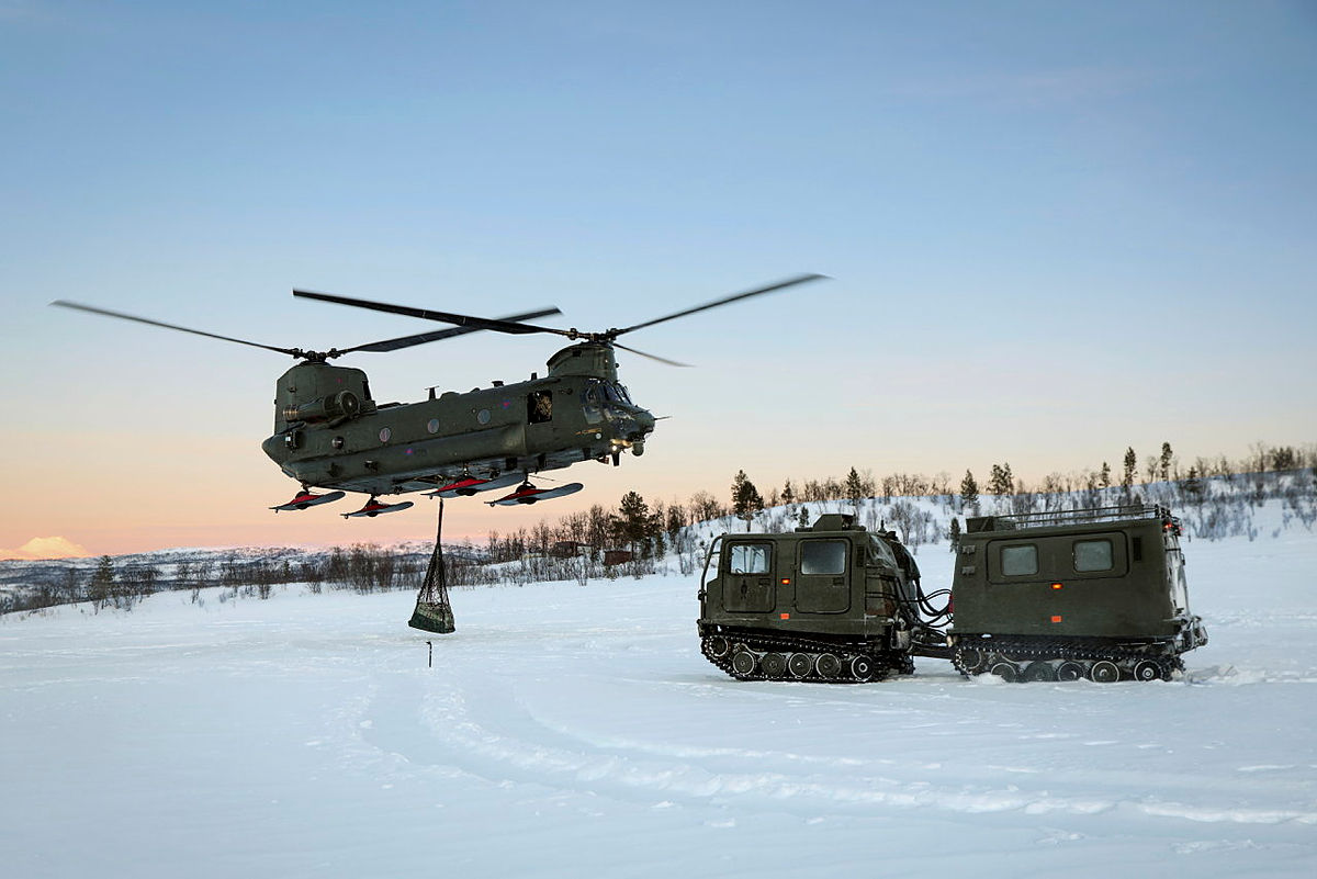 The deployment brings together Merlin, Wildcat and Chinook helicopters, with aircrews, engineers and ground personnel working to maintain operational effectiveness in snow, ice and sub zero temperatures. During recent training serials, Chinook helicopters from 18 Squadron were fitted with specialist snow skis while conducting underslung load lifts. The skis attach to the aircraft’s wheels to prevent them from sinking into deep snow, allowing safe landings and operations in Arctic and mountainous environments by distributing the helicopter’s weight.
