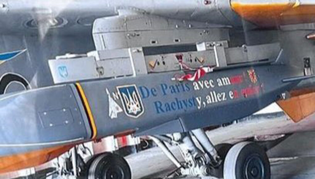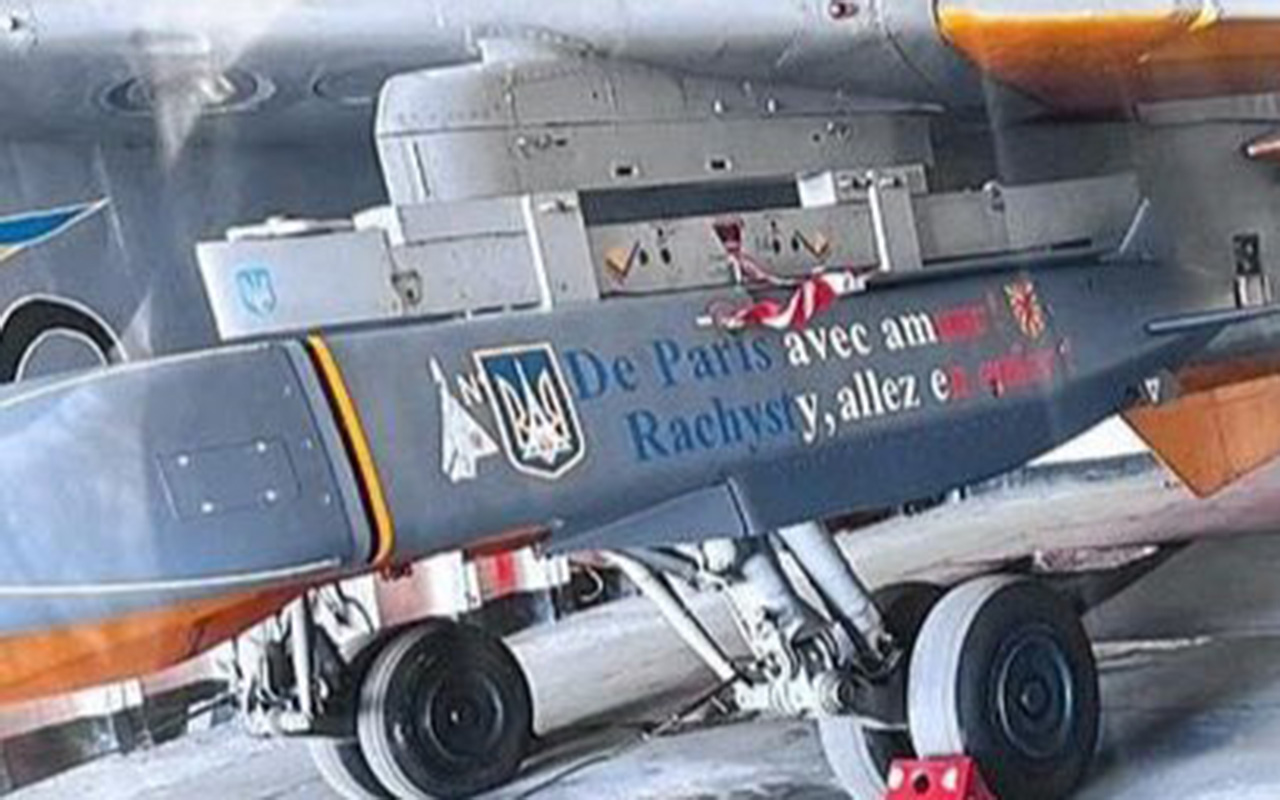 French-supplied SCALP cruise missile mounted on a Ukrainian Su-24, sporting the text “De Paris avec amour, Rachysty, allez en enfer”