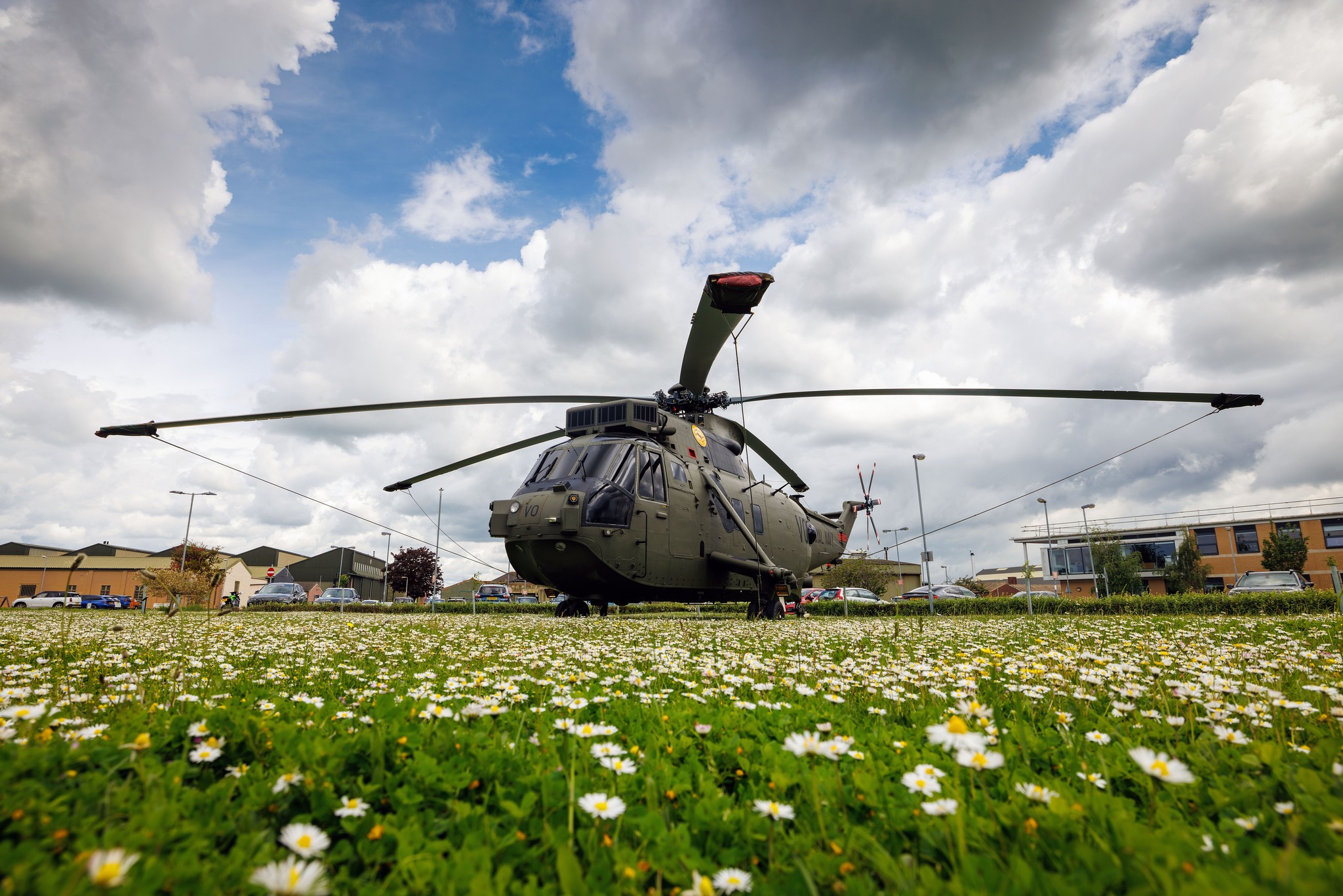 Positioned in front of Yeovilton’s headquarters building, the helicopter stands with its rotors spread, ready for display.