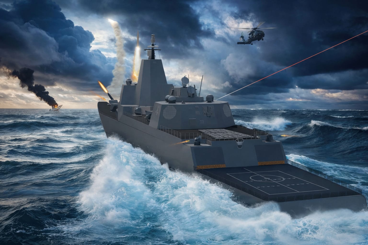 Defensive systems are a defining element of the design. The diagram shows two 300-kilowatt laser weapons, with programme material indicating the potential to scale these to 600-kilowatt class systems. These directed-energy weapons are intended to counter drones, missiles and small surface threats while reducing dependence on interceptor missiles.