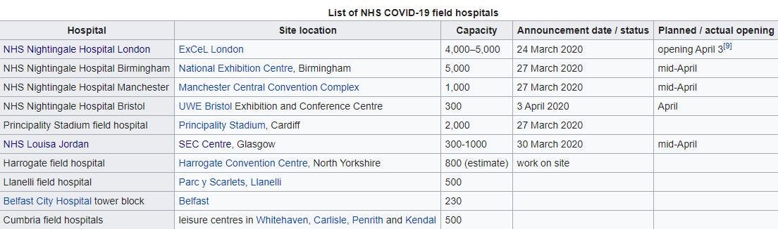 There are ten temporary critical care hospitals being set up by the National Health Service and British Army as part of the response to the COVID-19 pandemic.